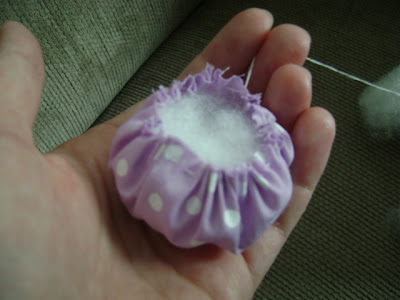 3- Puxe a linha fazendo uma bolsinha, coloque a manta acrílica e termine de puxar até fechar. Arremate bem e repita o processo com todos os círculos.